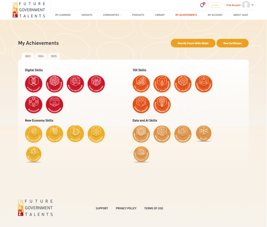 1. Skills of the FUTURE for the Government of the FUTURE: Jahiz delivers an interactive customized journey across critical skills closely linked to the future of government work, and aligned with the vision of the UAE, categorized under: