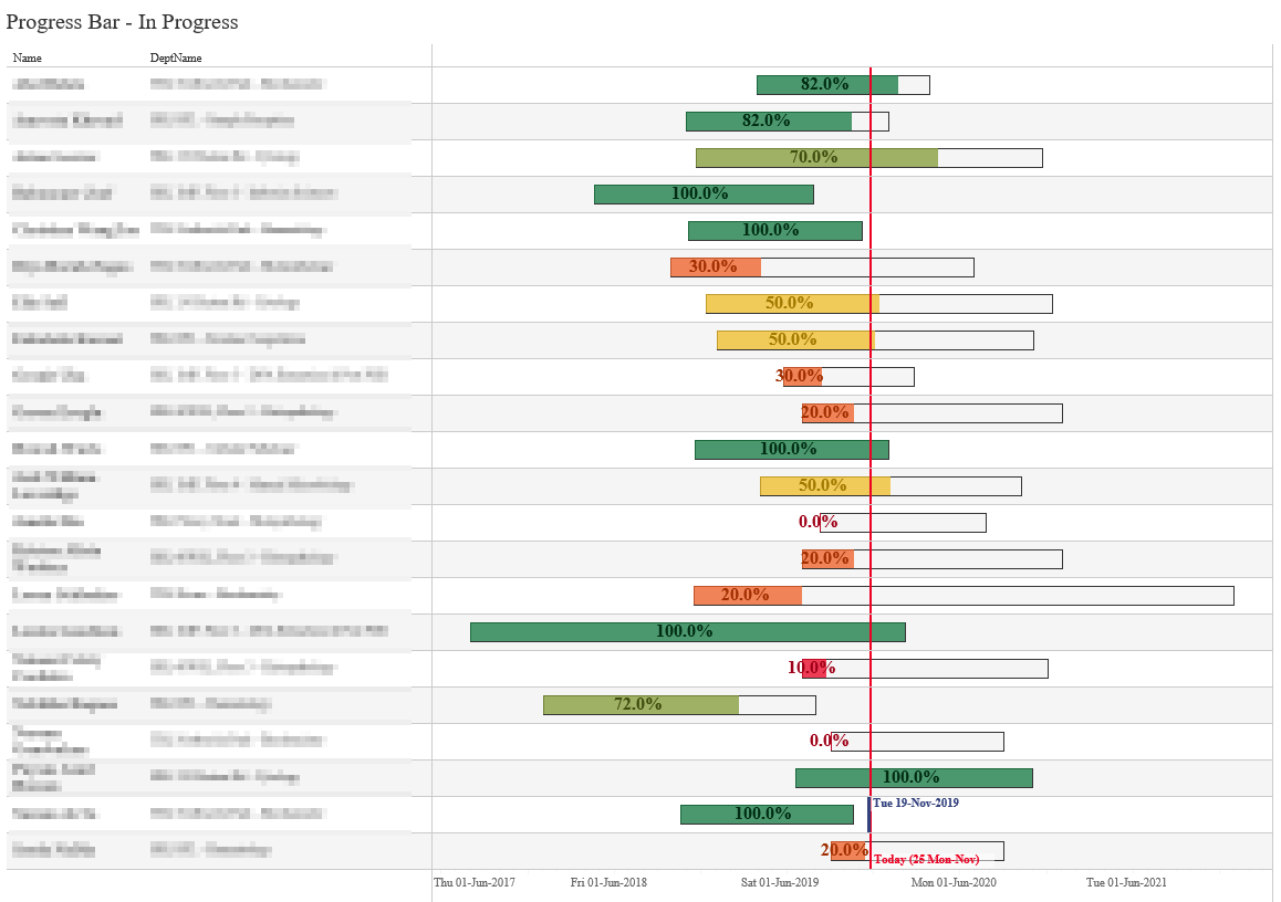 The reporting of this information was via Tableau, a business analytics platform that is in use within the company. Due to Totara being open source TDL were able to connect Tableau to Totara to allow data from Totara to be displayed within a Tableau report. The data from the portfolio courses graphically displayed the progress of a portfolio through a bar being coloured in based on the number of activities (quizzes) that Totara identified as complete. A constantly moving red line identified ‘today’ to allow easy visualisation of whether a portfolio is on track or running behind.