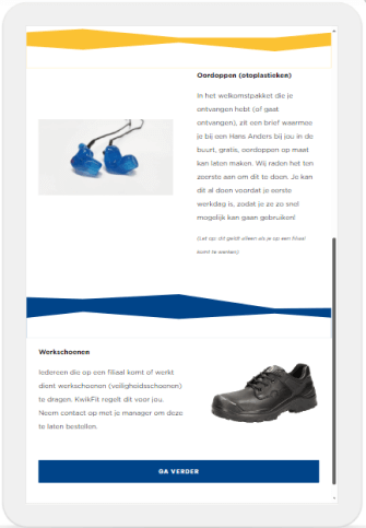 In Kürze wird das Pre-Boarding-Programm um ein Willkommenspaket erweitert. Dieses Paket enthält eine Zeitschrift, eine Einladung zum Anpassen von maßgefertigten Ohrstöpseln, eine Schutzbrille und Konfetti. Das Paket enthält auch eine Karte mit Informationen über die KwikFit-Akademie, die ein zusätzlicher Anreiz für die Teilnahme am Pre-Boarding-Programm sein wird. Wenn Mitarbeiter erst einmal bei KwikFit sind, bleiben sie oft lange Zeit. Das Pre-Boarding-Programm trägt zu einem guten Start im Unternehmen bei.