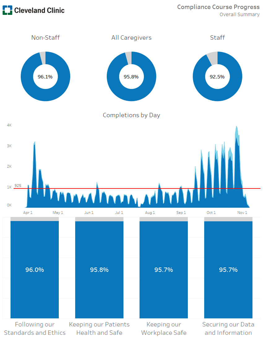Cleveland Clinic processes over 100,000 user records on a daily basis (updates and new account creations). These records each contain up to 62 unique demographic fields from nine different source systems.They have created dashboards with both Zoola and Tableau and deployed over 100 custom dashboards to the enterprise.As a result of these initiatives, Cleveland Clinic has reduced its annual spend on learning technology by approximately 70%, from a combined total over $1.1 million to roughly $350k. This reduction includes merger and acquisition hospitals that no longer needed their own LMS.
